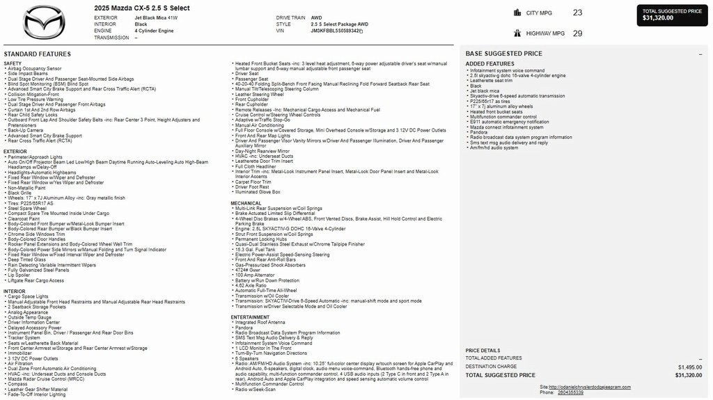 CX-5 2.5 S Select Package, AWD, Alloy wheels, AppLink/Apple CarPlay and Android Auto, Auto High-beam Headlights, Exterior Parking Camera Rear, Heated front seats, Leatherette Seat Trim, Power driver seat, Rain sensing wipers.