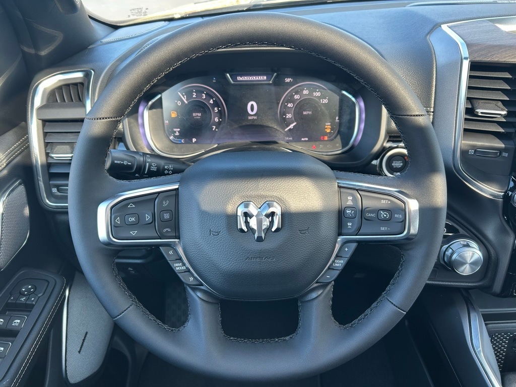 14.4" Touchscreen Display, 3.92 Rear Axle Ratio, 4G LTE Wi-Fi Hot Spot, Accent Color Door Handles, Accent Color Premium Power Mirrors, Accent Color Tailgate Handle, Anti-Spin Differential Rear Axle, Auto Power-Folding Mirrors, Auto-Dimming Exterior Driver Mirror, Black Exterior Truck Badging, Black Headlamp Bezels, Black Interior Accents, Black Painted Exterior Mirrors Caps, Black Tail Lamp Bezels, Body Color Front Bumper, Cluster 12" TFT Color Display, Connectivity - US/Canada, Convex Wide-Angle Exterior Mirror Insert, Dome Dual LED Reading Lamp, Dual-Pane Panoramic Sunroof, Exterior Mirrors Approach Lamps, Exterior Mirrors Courtesy Lamps, Front Passenger Interactive Display, GPS Navigation, Grille Surround 3 Black Texture 2 Black, Integrated Center Stack Radio, Laramie Level 2 Equipment Group, LED Dome/Reading Lamp, Mopar Black Tubular Side Steps, Night Edition, Pirelli Brand Tires, Power Tailgate, Proximity Approach/Departure Lamps, Quick Order Package 21H Laramie, Rain Sensitive Windshield Wipers, RAM Grille Badge - Black, SiriusXM Radio Service, Sport Performance Hood, USB Host Flip, Wheels: 22" x 9" Forged Aluminum.