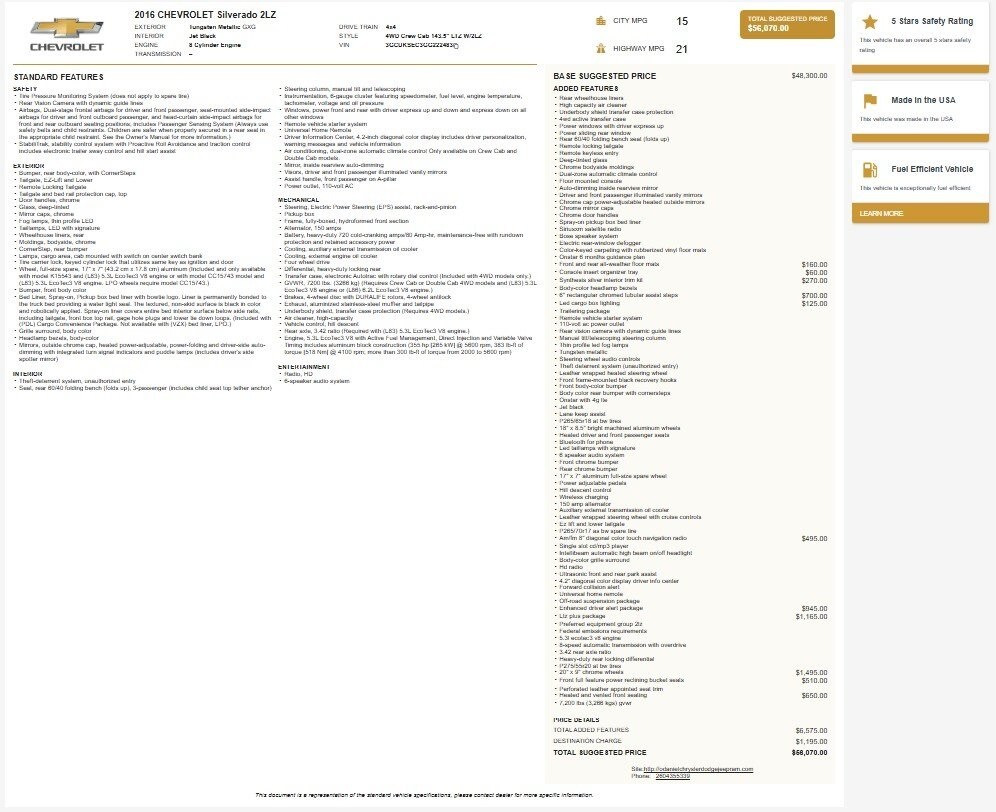 1 Owner, Silverado 1500 LTZ 2LZ, EcoTec3 5.3L V8, 4WD, 110-Volt AC Power Outlet, 150 Amp Alternator, 4.2" Diagonal Color Display Driver Info Center, 6 Speaker Audio System, Auto-Dimming Inside Rear-View Mirror, Auxiliary External Transmission Oil Cooler, Bluetooth® For Phone, Body Color Rear Bumper w/Cornersteps, Body-Color Grille Surround, Body-Color Headlamp Bezels, Chrome Bodyside Moldings, Chrome Cap Power-Adjustable Heated Outside Mirrors, Chrome Door Handles, Chrome Mirror Caps, Color-Keyed Carpeting w/Rubberized Vinyl Floor Mats, Deep-Tinted Glass, Driver & Front Passenger Illuminated Vanity Mirrors, Dual-Zone Automatic Climate Control, Electric Rear-Window Defogger, Enhanced Driver Alert Package, EZ Lift & Lower Tailgate, Forward Collision Alert, Front Body-Color Bumper, Front Chrome Bumper, HD Radio, Heated & Vented Front Seating, Heavy-Duty Rear Locking Differential, IntelliBeam Automatic High Beam On/Off Headlight, Lane Keep Assist, Leather Wrapped Heated Steering Wheel, Leather Wrapped Steering Wheel w/Cruise Controls, LED Taillamps w/Signature, LTZ Plus Package, Manual Tilt/Telescoping Steering Column, OnStar 6 Months Guidance Plan, OnStar w/4G LTE, Perforated Leather Appointed Seat Trim, Power Adjustable Pedals, Power Sliding Rear Window, Power Windows w/Driver Express Up, Preferred Equipment Group 2LZ, Rear 60/40 Folding Bench Seat (Folds Up), Rear Chrome Bumper, Rear Vision Camera w/Dynamic Guide Lines, Rear Wheelhouse Liners, Remote Keyless Entry, Remote Locking Tailgate, Remote Vehicle Starter System, Single Slot CD/MP3 Player, Spray-On Pickup Box Bed Liner, Steering Wheel Audio Controls, Theft Deterrent System (Unauthorized Entry), Thin Profile LED Fog Lamps, Trailering Package, Ultrasonic Front & Rear Park Assist, Universal Home Remote, Wheels: 20" x 9" Chrome.